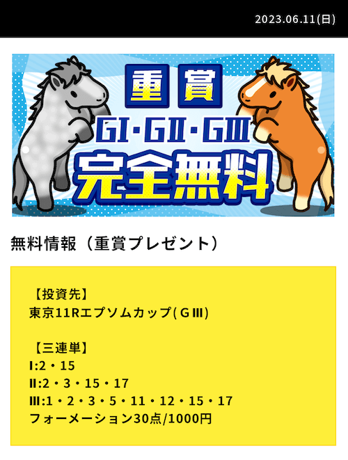 しかも重賞が開催される度に、追加でもう1つ無料予想が増えるのありがたすぎ〜 -
