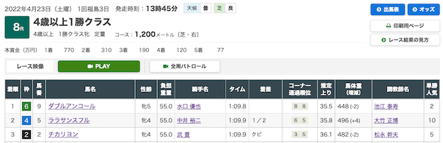 オッズ 9.3倍 投資金額 10,000円 点数 5点 払戻金額 18,600円 結果 着順 馬番 馬名 1着 8番 ココクレーター 2着 1番 ダイシンヤマト 3着 11番 ランドグリーズ 天候 晴
